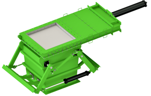 • Una variación de la clásica "compuerta flop", este diseño elimina la necesidad de sellos al canalizar el material por la descarga seleccionada